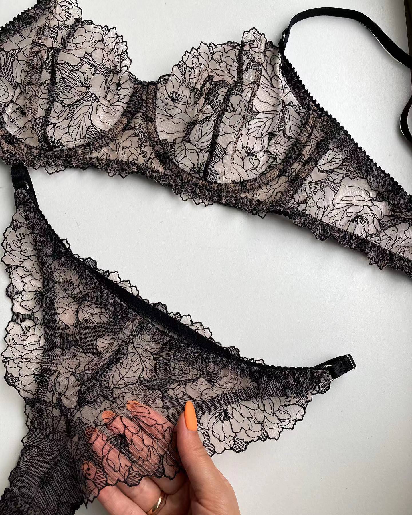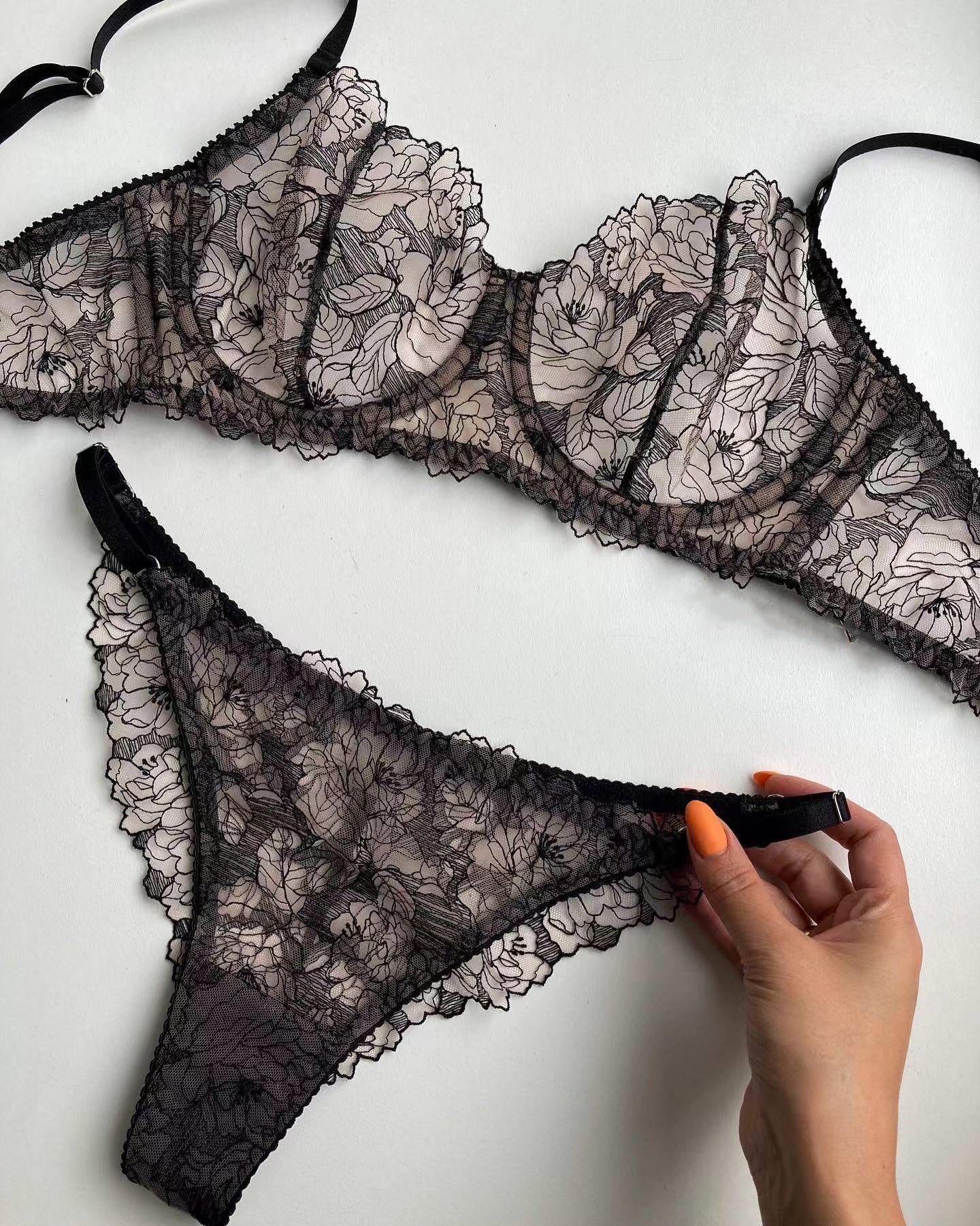 Two piece set including embroidered floral coffee bean colour design. Wired bra and bottoms.